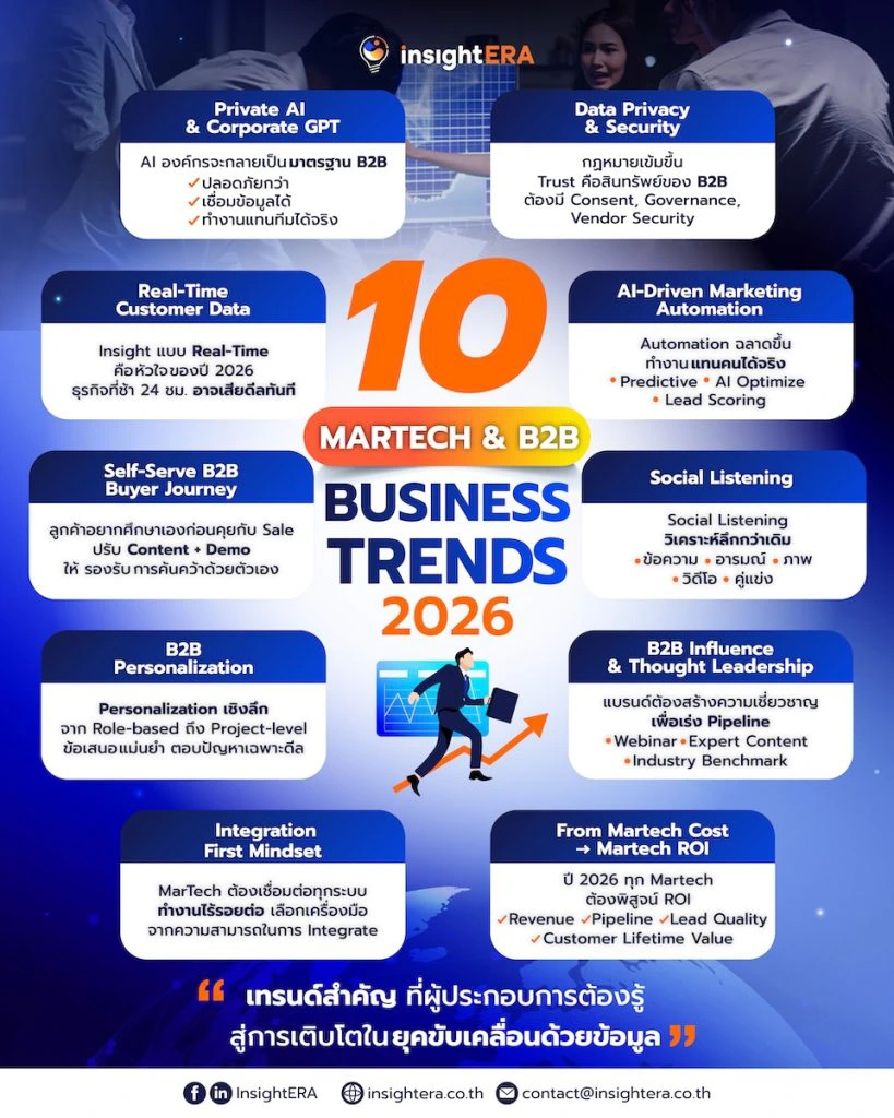 บทความนี้จึงรวบรวม 10 เทรนด์สำคัญในปี 2026 ที่ผู้ประกอบการและนักการตลาด B2B ควรรู้ เพื่อเตรียมกลยุทธ์และระบบ Martech ให้พร้อมรองรับการแข่งขันที่เข้มข้นยิ่งกว่าเดิม