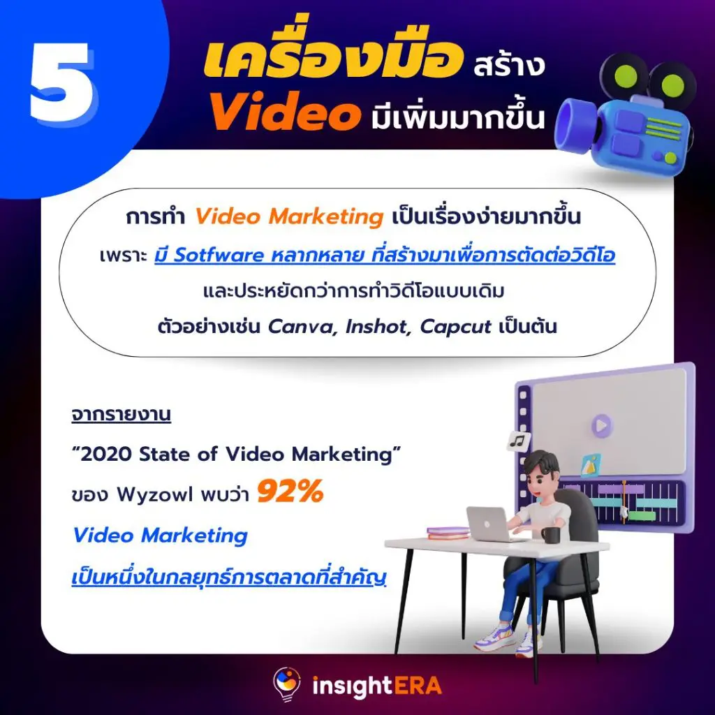 ปัจจุบันการทำ Video Marketing ง่ายขึ้น เพราะมีเครื่องมือมากมายที่ช่วยตอบโจทย์การผลิตงาน VDO และช่วยในการตัดต่อ VDO ได้ง่าย และประหยัดกว่าการทำ VDO ในรูปแบบเดิม ตัวอย่างเช่น Canva, Inshot, Capcut เป็นต้น