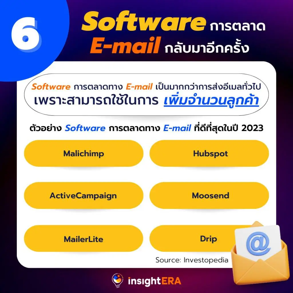 การตลาดผ่าน E-mail เป็นเครื่องมือทางการตลาดที่มีมาอย่างยาวนาน ปัจจุบันมีการพัฒนา Software เพื่อทำการตลาดผ่านอีเมล สิ่งสำคัญคือการเลือก Software ที่เหมาะสม ซึ่งจะช่วยยกระดับการตลาดของแบรนด์ให้โตขึ้นไปอีกขั้น