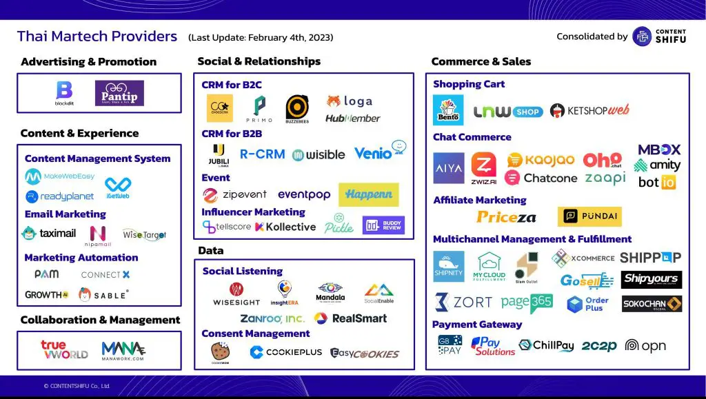 ตัวอย่างภาพด้านล่างคือ Martech Providers ของประเทศไทย ที่ทาง Content Shifu ได้รวบรวมผู้พัฒนาและผู้ให้บริการเครื่องมือ Martech ที่น่าสนใจไว้
