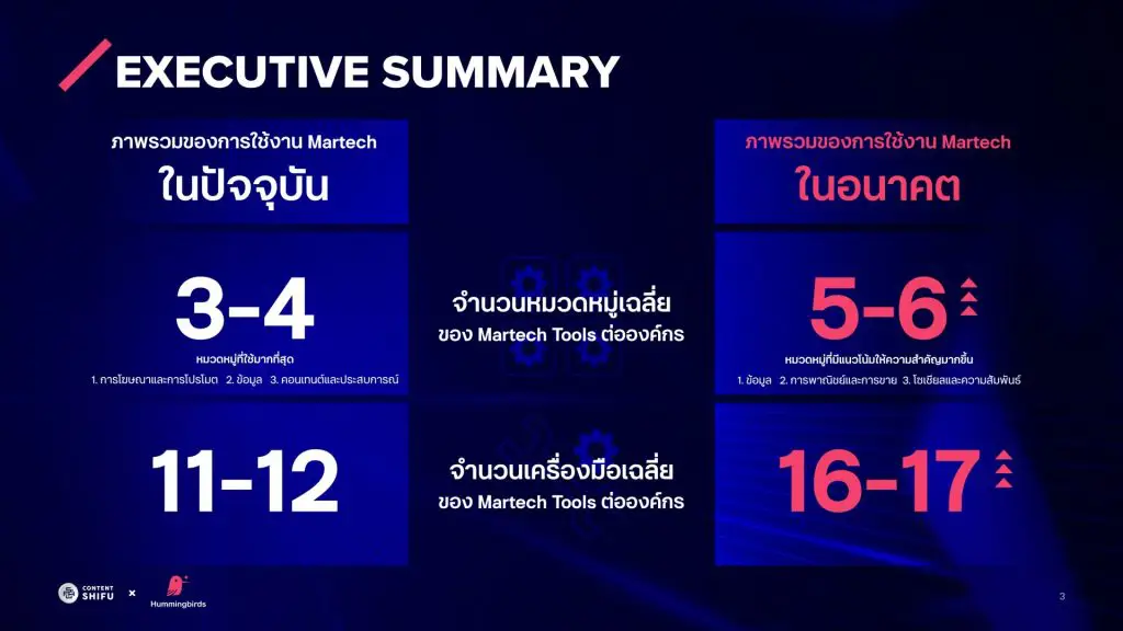 จากรายงานล่าสุดที่ Content Shifu ร่วมกับ Hummingbirds Consulting จัดทำแบบสอบถามเพื่อรวบรวมมุมมองของผู้ใช้งาน Martech จากหลากหลายวงการธุรกิจ และนำมาวิเคราะห์การใช้งาน Martech ในปัจจุบัน รวมถึงแนวโน้มที่จะเกิดขึ้นในอนาคต เพื่อจัดทำเป็น Martech Report เฉพาะสำหรับประเทศไทย ประจำปี 2023
