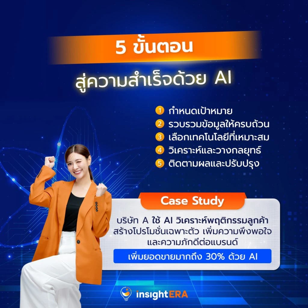 บริษัท A สามารถเพิ่มยอดขายได้ถึง 30% ภายใน 6 เดือน ด้วยการใช้ AI วิเคราะห์พฤติกรรมการซื้อสินค้า และสร้างโปรโมชั่นที่สอดคล้องกับความต้องการของลูกค้า ทำให้สามารถส่งมอบประสบการณ์ที่ตรงใจลูกค้าและเพิ่มความภักดีต่อแบรนด์AI-Driven Customer Insights ไม่เพียงช่วยธุรกิจแปลงข้อมูลจำนวนมหาศาลให้กลายเป็นความได้เปรียบเชิงกลยุทธ์ แต่ยังช่วยสร้างประสบการณ์ลูกค้าที่ดียิ่งขึ้น เพิ่มความภักดี และสร้างความยั่งยืนในระยะยาว ในยุคที่การแข่งขันสูง การนำ AI มาช่วยขับเคลื่อนการตลาดจึงไม่ใช่ตัวเลือกอีกต่อไป แต่เป็นสิ่งจำเป็นที่ทุกธุรกิจต้องลงทุน
