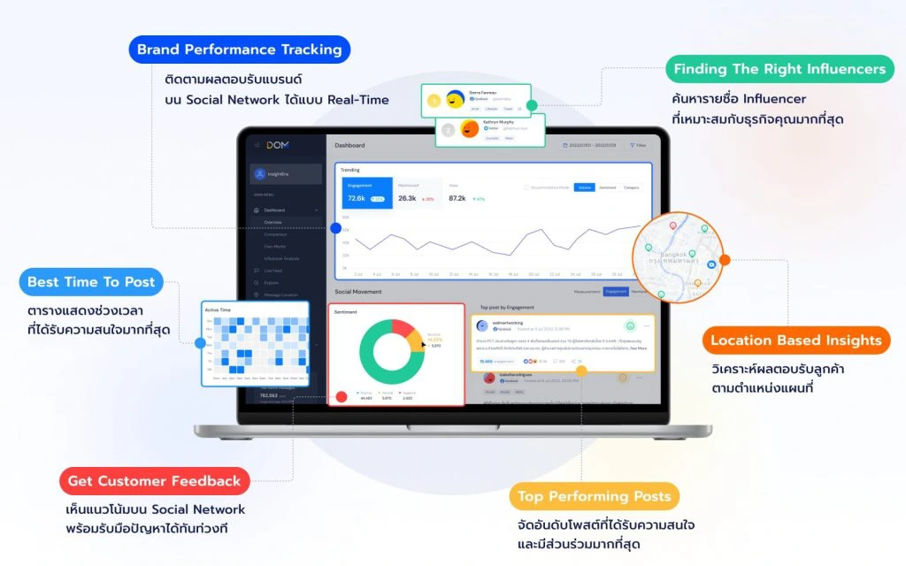 ที่สามารถแสดงตารางช่วงเวลาการโพสต์ที่จะได้รับความสนใจมากที่สุด เพื่อการวางกลยุทธ์ในการสร้าง Content ได้อย่างมีประสิทธิภาพอีกหนึ่ง Feature ของ DOM นอกจากจะเก็บรวบรวมข้อมูลจาก Social Media แบบ Real-time ได้แล้ว ยังสามารถดูผลลัพธ์รวมของโพสต์ที่ได้รับความสนใจมากที่สุดในหัวข้อที่เกี่ยวข้อง โดยเปรียบเทียบออกมาในรูปแบบตารางเวลาแบบเข้าใจง่าย ซึ่งการวิเคราะห์ของ DOM ยังสามารถ Filter เฉพาะหัวข้อ หรือเจาะจงแม้กระทั่งแบรนด์หรือคู่แข่งที่เราต้องการเปรียบเทียบได้อีกด้วย