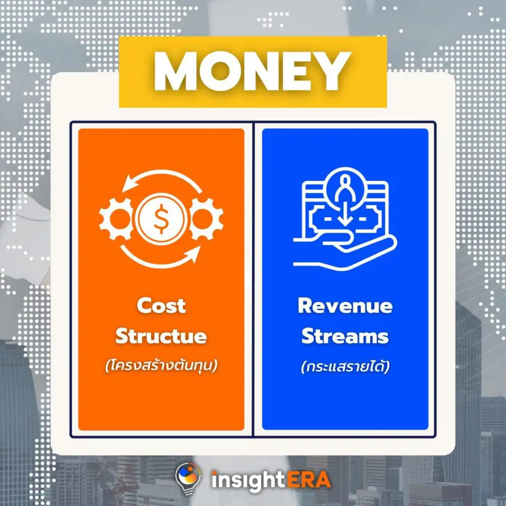 Revenue Streams : คือเงินสดที่ธุรกิจจะได้รับหลังหักค่าใช้จ่ายแล้ว ในธุรกิจหากลูกค้าเปรียบเหมือนหัวใจของโมเดลธุรกิจ กระแสรายได้ก็เปรียบได้กับเส้นเลือด ธุรกิจต้องถามตัวเองว่าลูกค้าแต่ละกลุ่มยินดีจ่ายเงินเพื่อคุณค่าใด กระแสรายได้แต่ละทางอาจมีกลไกการตั้งราคาที่แตกต่างกัน เช่น การตั้งราคาตายตัว การต่อรองราคา การประมูล การตั้งราคาตามตลาด การตั้งราคาตามปริมาณ