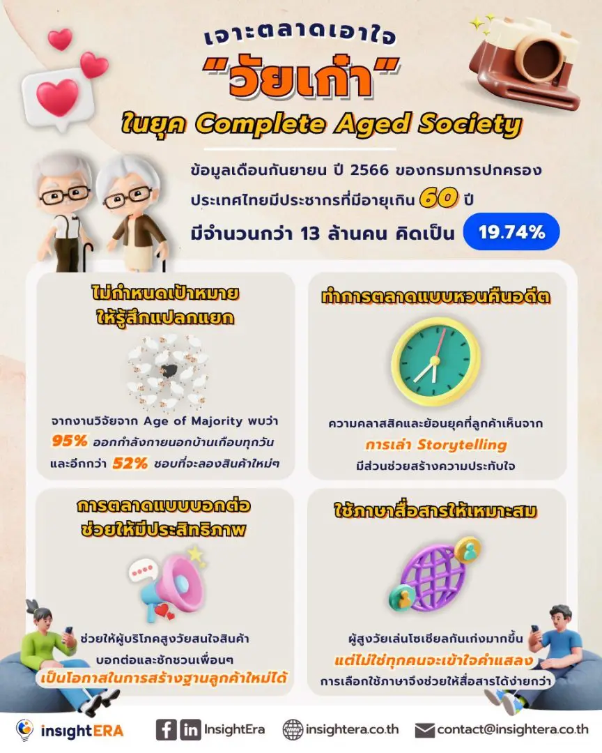 ถึงเรื่องของวัย อายุ หรือร่างกายที่เปลี่ยนแปลงไป เป็น inisight ที่แบรนด์เลือกหยิบมาใช้ในการสื่อสารได้ แต่ไม่ควรสื่อสารให้ดูน่ากลัว ดูน่าวิตกกังวล เพราะผู้สูงอายุเองก็ต้องการหาแรงบันดาลใจใหม่ ๆ ในการใช้ชีวิตต่อไป แม้จะอายุมากขึ้นทุกวันก็ตาม การสื่อสารในเชิงบวก เช่น การบอกว่าแบรนด์มีตัวช่วย มีสิ่งที่ทำให้ชีวิตพวกเขาง่ายขึ้น ก็สามารถทำให้ผู้บริโภคสูงวัยสนใจได้