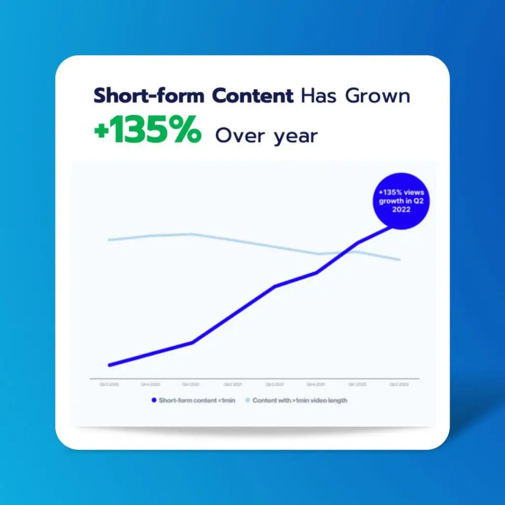 จากสถิติคอนเทนต์ที่เป็น วิดีโอสั้น (Short-Form Video) ที่มีความยาวไม่เกิน 60 วินาที มีอัตราการเติบโตมากถึง 135% เมื่อเทียบกับปี 2021 และยังมีแนวโน้มที่จะเติบโตขึ้นอย่างต่อเนื่อง (Source: Tubular Labs)