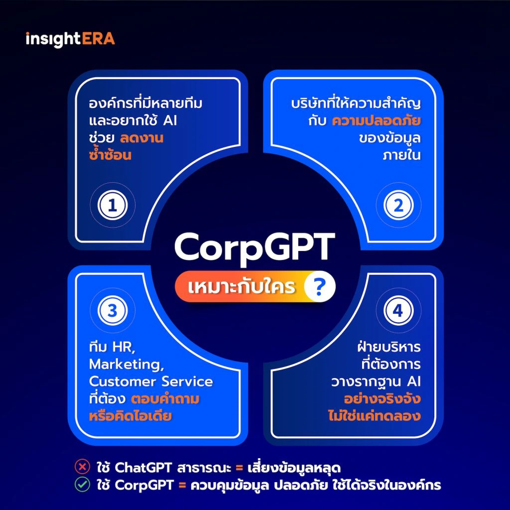 สำหรับ CorporateGPT ซึ่งมักถูกพัฒนาในลักษณะ AI ที่องค์กรควบคุมเอง (เช่น เทรนเอง โฮสต์เอง หรือใช้บริการที่ออกแบบเฉพาะองค์กร) จะสามารถกำหนดโมเดลการใช้งานได้ยืดหยุ่นมากกว่า ควบคุมงบประมาณได้แม่นยำตามการใช้งานจริง