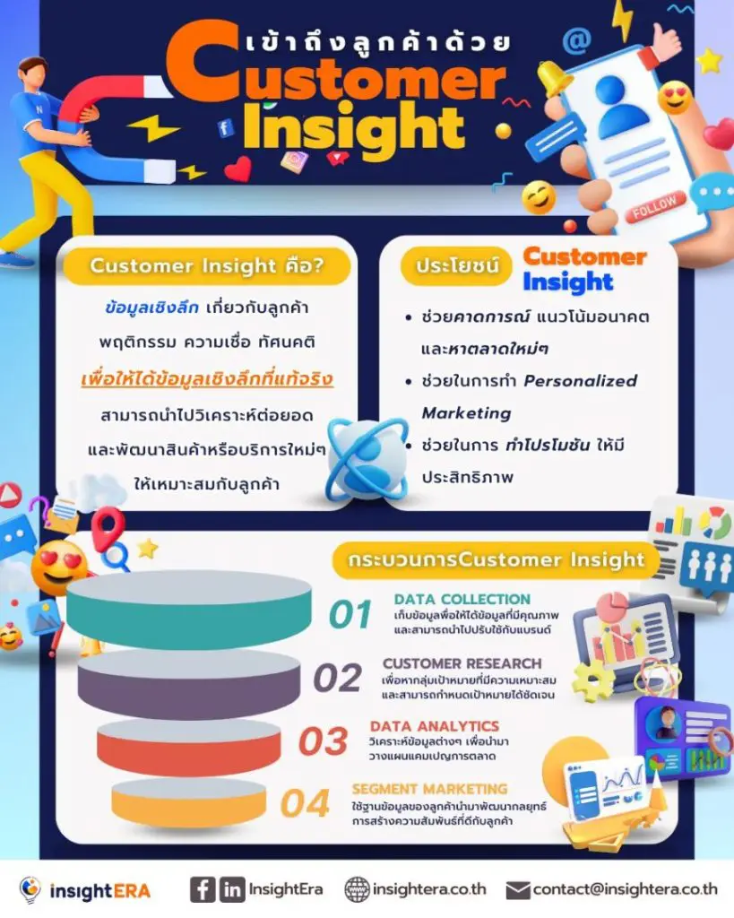 Customer Insight เป็นการศึกษาข้อมูลเชิงลึกเกี่ยวกับลูกค้า ซึ่งไม่ใช่เพียงข้อมูลเชิงประชากรทั่วไป อย่างเพศ อายุ รายได้ แต่รวมถึงข้อมูลความสนใจ ด้านพฤติกรรม ความเชื่อ ทัศนคติต่างๆ โดยในการวิเคราะห์อาจรวมไปถึงพฤติกรรมการซื้อในอดีต พฤติกรรมการค้นหาสินค้าผ่านจากทั้งช่องทางออนไลน์และออฟไลน์ เพื่อให้ได้ข้อมูลเชิงลึกที่แท้จริงที่สามารถนำไปวิเคราะห์ต่อยอดและพัฒนาสินค้าหรือบริการใหม่ๆ ให้เหมาะสมกับลูกค้า