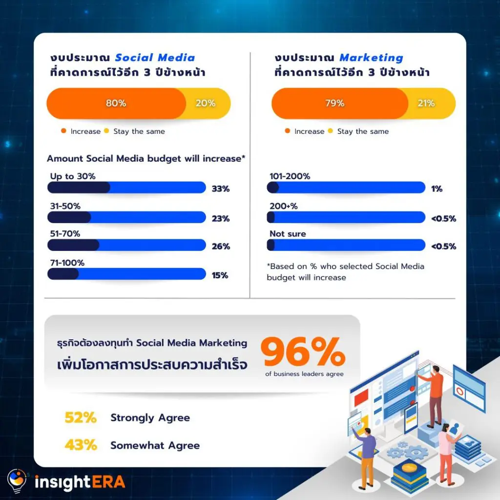 กว่า 80% ของผู้นำด้านธุรกิจคาดว่างบประมาณ Social Media ของบริษัทจะเพิ่มขึ้นในอีก 3 ปีข้างหน้า และคาดว่าในบริษัทของตัวเอง กว่า 2 ใน 5 หรือคิดเป็น 44% ประเมินว่างบประมาณด้าน Social Media จะเพิ่มขึ้นมากกว่า 50%