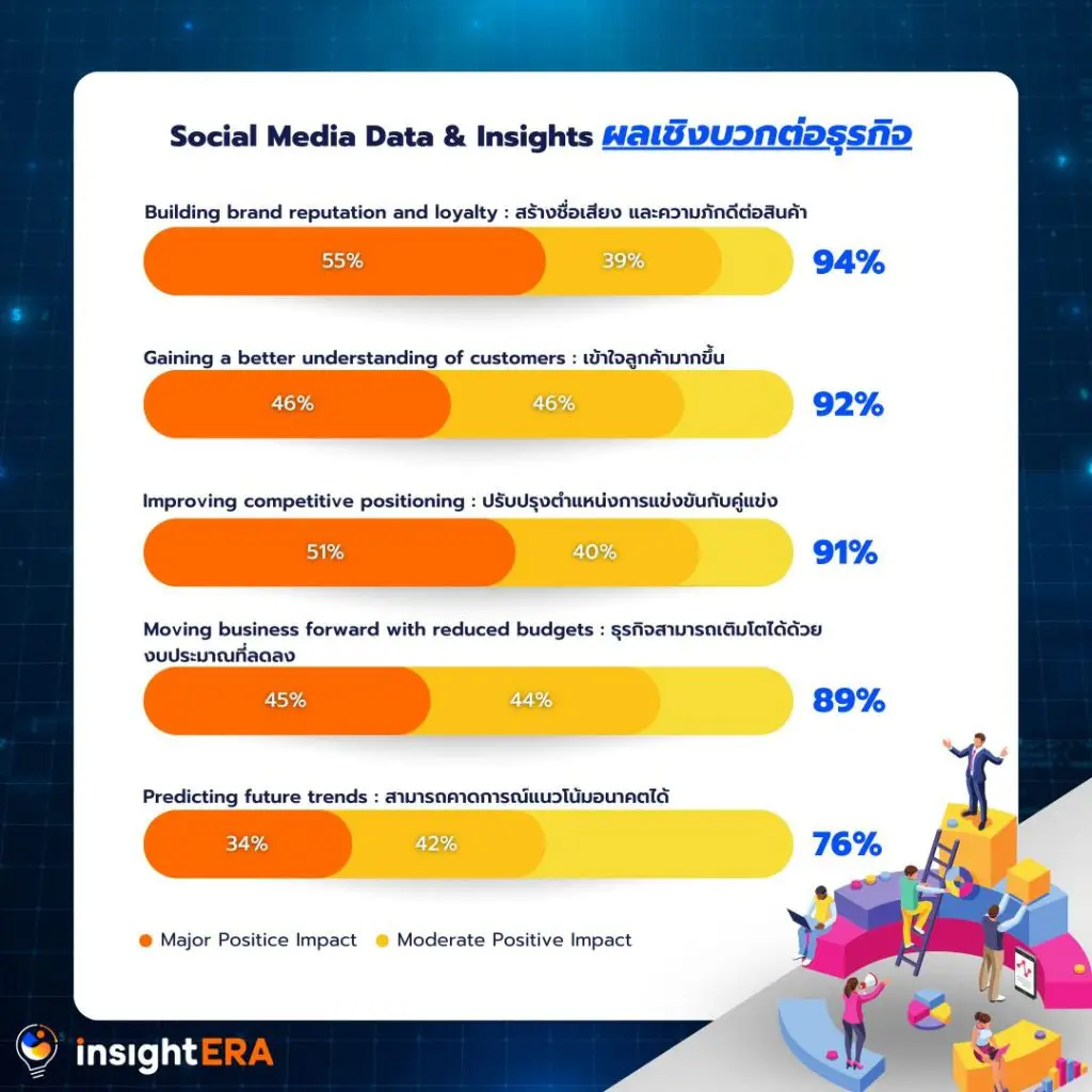 Social Media Data & Insights มีผลเชิงบวกต่อธุรกิจ การมีข้อมูล Social Media Data & Insights ที่มากจะทำให้ธุรกิจได้เปรียบทางการแข่งขันในอุตสาหกรรม เพราะการที่มีข้อมูลจำนวนมากจะเป็นตัวชี้วัดได้ว่า การสร้างชื่อเสียงของแบรนด์ประสบความสำเร็จหรือไม่ รวมถึงจะช่วยให้เข้าถึงลูกค้า และสามารถปรับปรุงข้อบกพร่องให้ตรงจุดได้