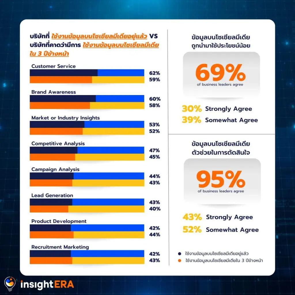ซึ่งเราจะพาไปดู 5 ประโยชน์จากมี Social Media Data & Insights กัน 1. Building Brand Reputation and Loyalty : สร้างชื่อเสียง และความภักดีต่อสินค้า 2. Gaining a Better Understanding of Customers : เข้าใจลูกค้ามากขึ้น 3. Improving Competitive Positioning : ปรับปรุงตำแหน่งการแข่งขันกับคู่แข่ง 4. Moving Business Forward with Reduced Budgets : ธุรกิจสามารถเติมโตได้ด้วยงบประมาณที่ลดลง 5. Predicting Future Trends : สามารถคาดการณ์แนวโน้มอนาคตได้