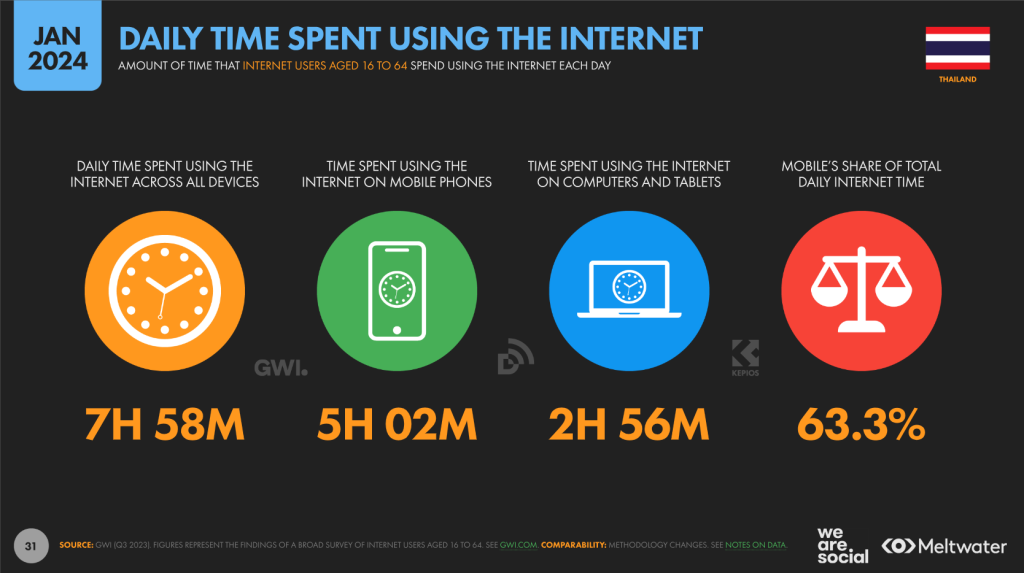 คนไทยใช้งาน Internet น้อยลง 1.6% เมื่อเทียบกับปี 2023 เหลืออยู่ที่ 7 ชั่วโมง 58 นาที ซึ่งน้อยลง 7 นาที