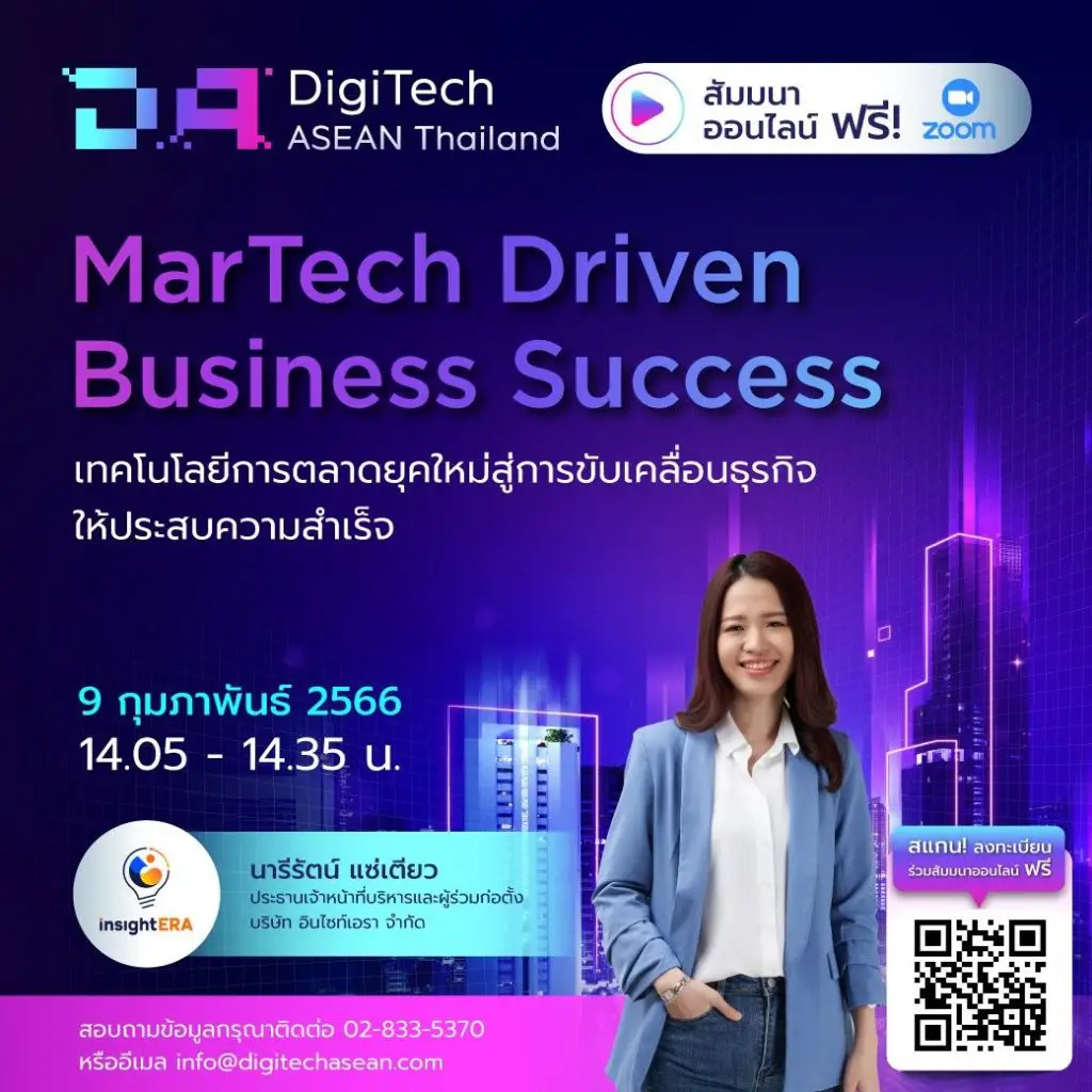 “MarTech Driven Business Success” “เทคโนโลยีการตลาดยุคใหม่ สู่การขับเคลื่อนธุรกิจให้ประสบความสำเร็จ”พร้อมรับความรู้และแนวคิดในการนำเทคโนโลยีทางการตลาดมาเพื่อช่วยพัฒนาแคมเปญทางการตลาดของคุณให้แม่นยำมากขึ้นเพื่อสร้างยอดขายและการรับรู้แบรนด์ให้เกิดขึ้น