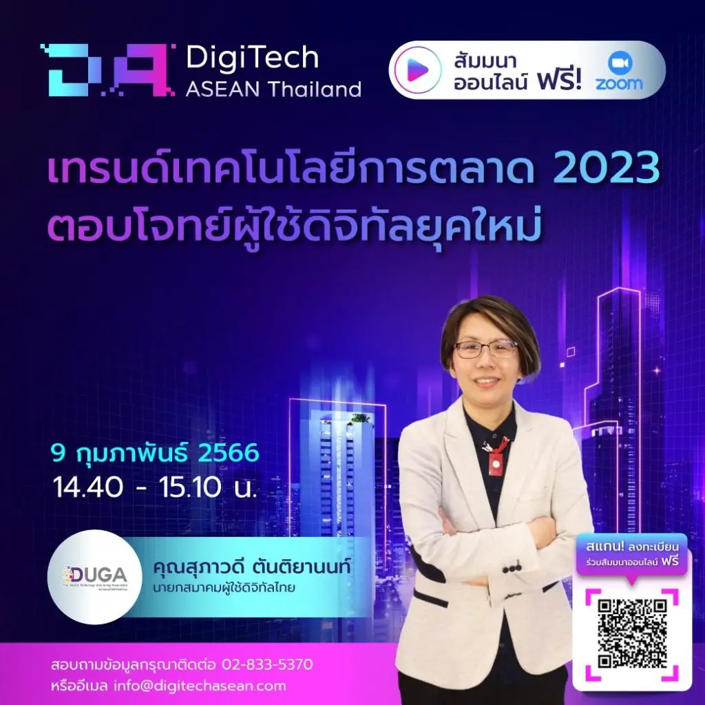 14.40 – 15.10 น. เทรนด์เทคโนโลยีการตลาด 2023 ตอบโจทย์ผู้ใช้ดิจิทัลยุคใหม่บรรยายโดย คุณสุภาวดี ตันติยานนท์ นายกสมาคมผู้ใช้ดิจิทัลไทย
