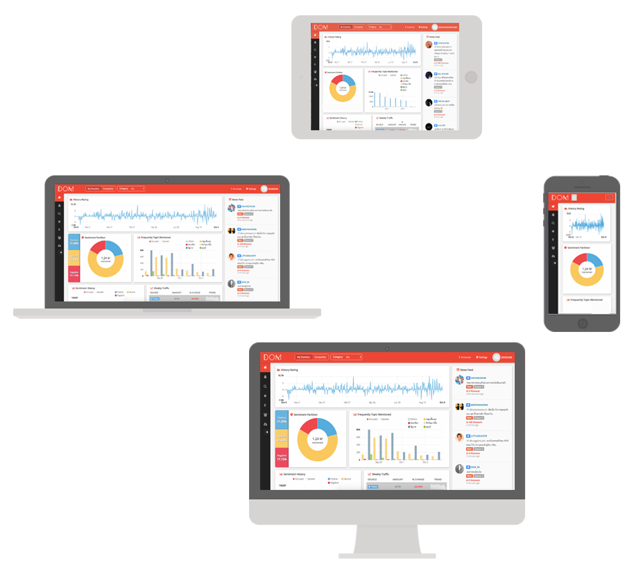 DOM เครื่องมือวิเคราะห์ข้อมูลบนโซเชียลเน็ตเวิร์ค ที่จะช่วยพัฒนากลยุทธ์และแผนการตลาดของคุณให้ดียิ่งขึ้นด้วยความสามารถหลากหลาย เช่น การวิเคราะห์ความคิดเห็นของข้อความทั้งภาษาไทยและภาษาอังกฤษ การวิเคราะห์กระแสนิยมบนโลกออนไลน์ และการจำแนกกลุ่มของข้อความต่างๆ