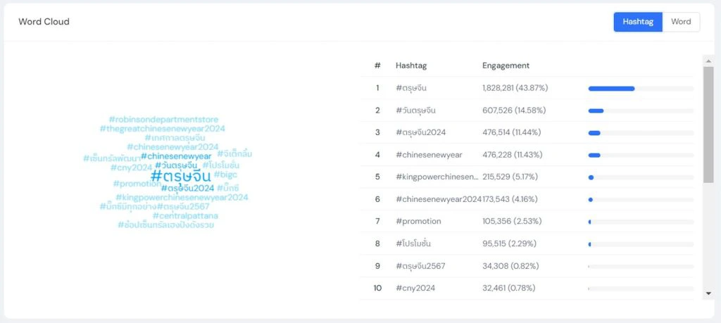นอกจากนั้นจะเห็นได้ว่า Hastag ที่ได้รับความสนใจสูงจะเกี่ยวข้องกับการจัดงานเฉลิมฉลองอย่าง #KingPowerChineseNewYear2024 ที่มีดาราและนักแสดงชื่อดังหลายท่านมาร่วมงาน และโปรโมชั่นของห้างสรรพสินค้าต่างๆ ไม่ว่าจะ Central, Robinson หรือ BigC ทำให้เห็นได้ว่าผู้คนยังสนใจสินค้าราคาโปรโมชั่นตามเทศกาล