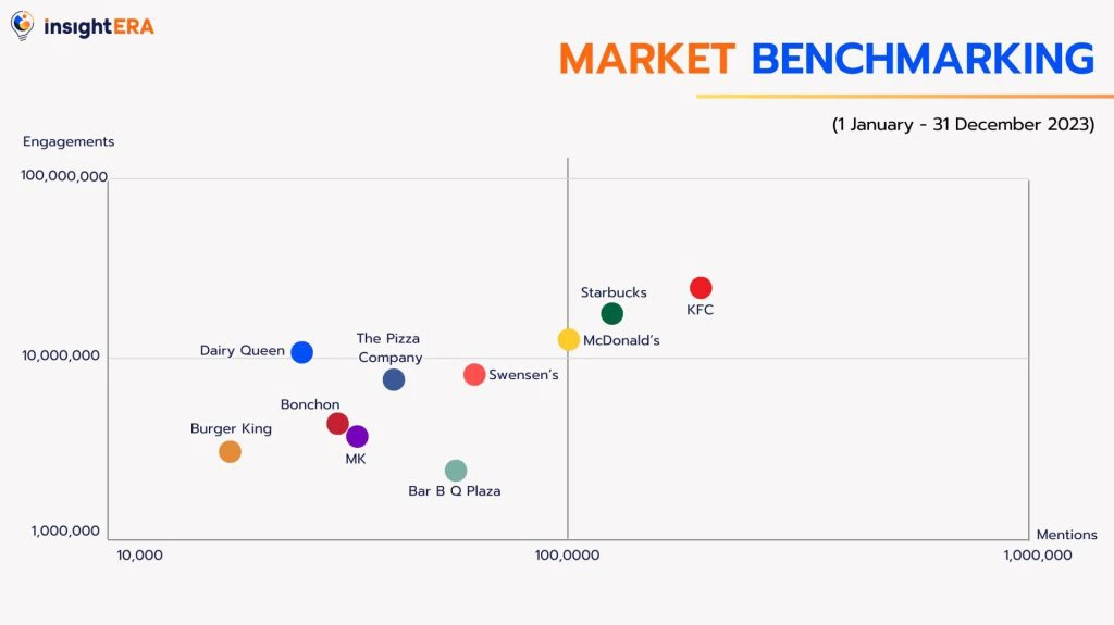 ในบรรดาร้านอาหารทั้งหมด KFC ถือเป็นแบรนด์ที่ได้รับความสนใจบนโซเชียลมีเดียมากที่สุด โดยได้รับการถูกพูดถึงมากกว่า 326,617 Mentions และมี 28,812,201 Engagement
