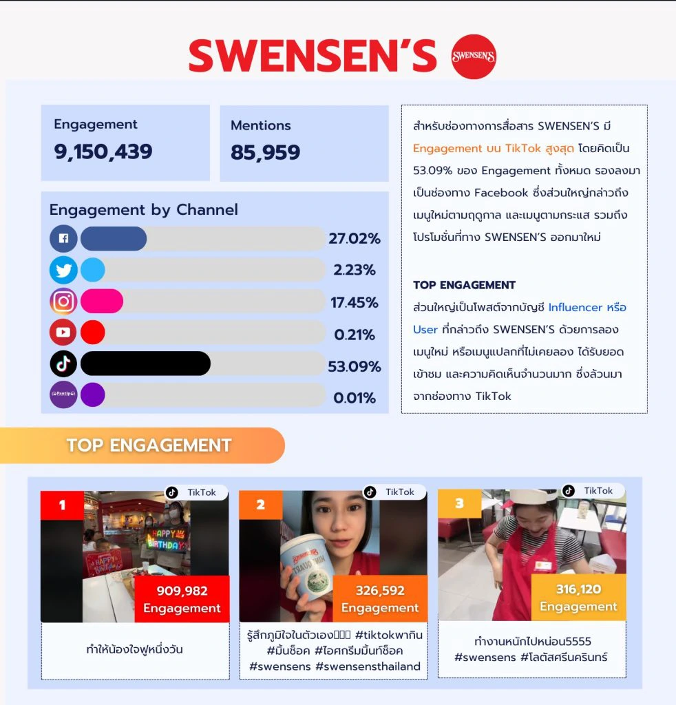 SWENSEN’S ก็ถือเป็นอีกแบรนด์หนึ่งที่มีความน่าสนใจไม่แพ้กันค่ะ ที่มักมีเมนูใหม่ตามฤดูกาล และเมนูตามกระแส รวมถึงโปรโมชั่นที่ทาง SWENSEN’S ออกมาใหม่ โดยได้รับการถูกพูดถึงมากกว่า 85,959 Mentions และมี 9,150,439 Engagement