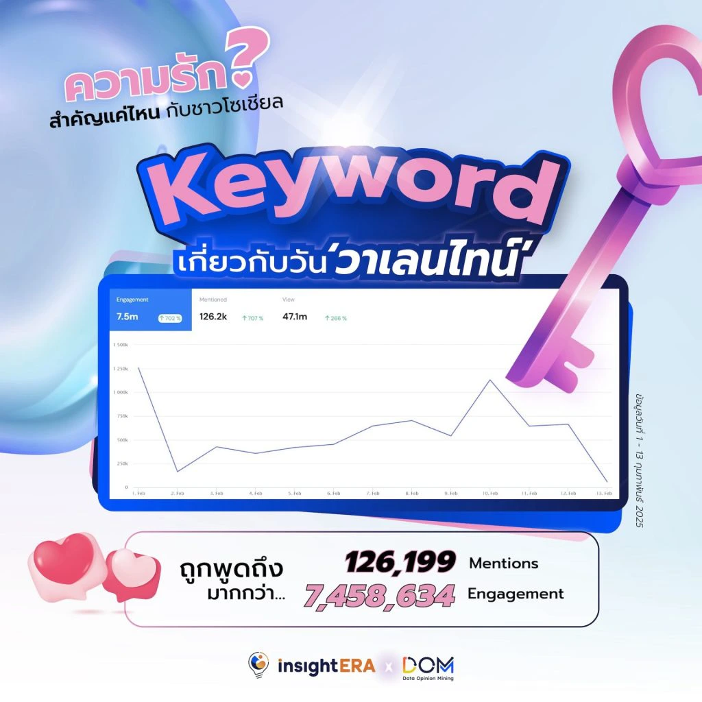เมื่อดูจากช่วงเวลาที่มีการพูดถึงวันวาเลนไทน์ตั้งแต่วันที่ 1-13 กุมภาพันธ์ 2025 ผลการสำรวจพบว่า มีการถูกพูดถึงมากกว่า 126,199 Mentions และมี 7,458,634 Engagement