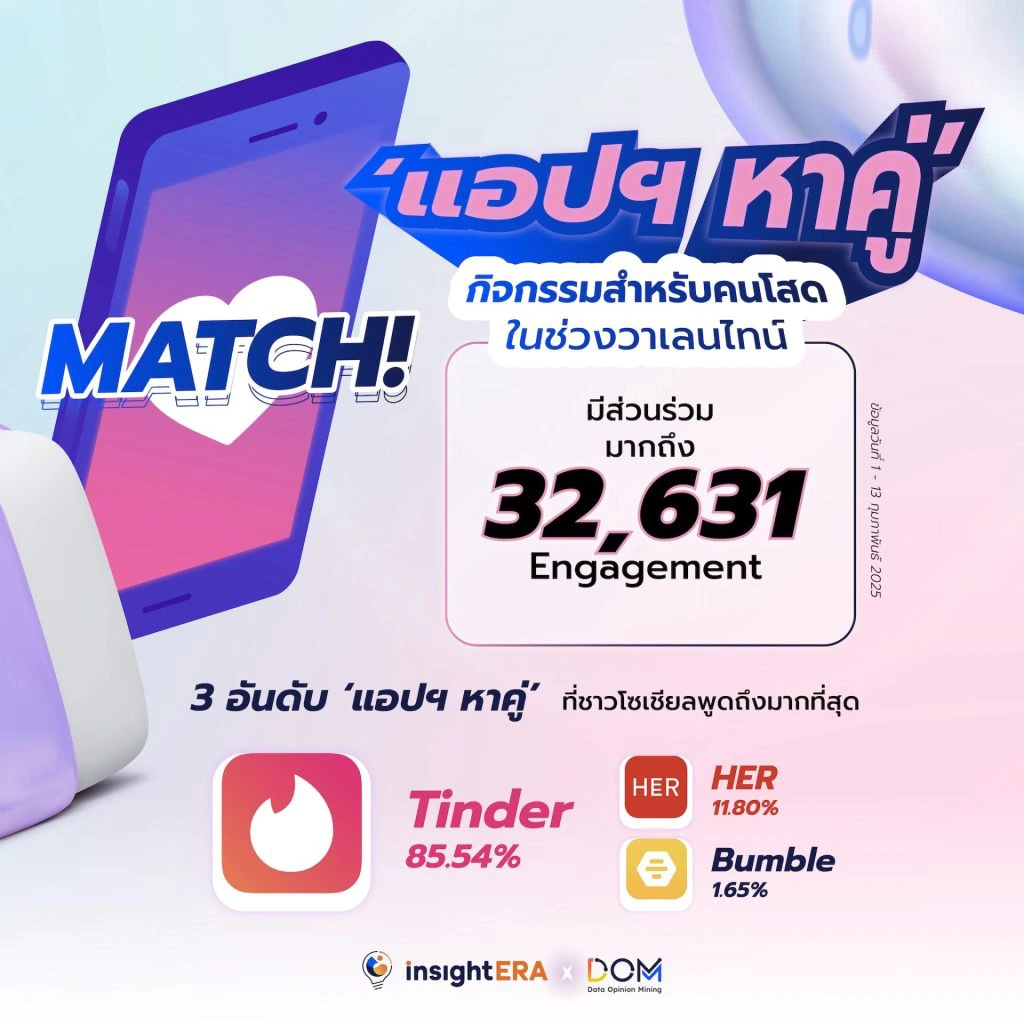 ในปีนี้ ‘แอปฯ หาคู่’ คนมีส่วนร่วม 32,631 Engagement เนื่องจากมีแอปให้เลือกมากมาย เช่น Tinder, Bumble, Hinge และ Coffee Meets Bagel ทำให้ความน่าตื่นเต้นลดลง อีกทั้งบางคนอาจเคยพบเจอประสบการณ์ที่ไม่ดี เช่น การแอบอ้างตัวตน (catfish), คุยแล้วหาย (ghosting) หรือแม้แต่ข่าวเกี่ยวกับมิจฉาชีพ (scammer) ทำให้บางคนรู้สึกไม่ปลอดภัย ซึ่งปัจจุบัน โซเชียลมีเดียอย่าง Instagram ขึ้นแท่นแพลตฟอร์มหาคู่แซงหน้า Tinder ไปแล้ว แต่อย่างไรก็ตาม ‘แอปฯ หาคู่’ ยังคงเป็นตัวเลือกที่สะดวกสำหรับผู้ที่มีงานยุ่ง และไม่มีเวลาหาคู่ หรือผู้ที่ต้องการคัดกรองก่อนตัดสินใจเจอกันในชีวิตจริง