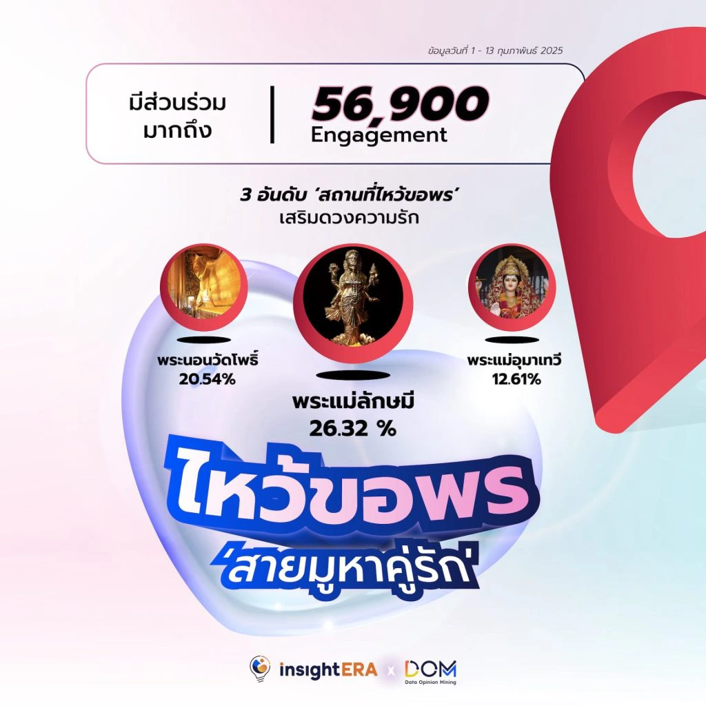 เทศกาลแห่งความรักนี้ไม่ใช่แค่คนมีคู่ที่สนใจ แต่คนโสดหลายคนก็หันไปพึ่ง ‘สายมู’ เพื่อขอให้ได้พบคู่ที่เหมาะสม และคนมีแฟนก็อยากให้รักยืนยาว การไหว้ขอพรจากสิ่งศักดิ์สิทธิ์ในช่วงวันวาเลนไทน์นั้นจึงได้รับความนิยมอย่างมาก ซึ่งทำให้มีส่วนร่วมจากชาวโซเชียลถึง 56,900 Engagement