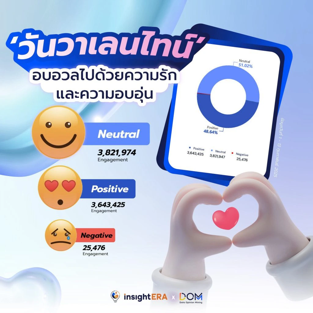จากการวิเคราะห์ของเครื่องมือ DOM ‘วันวาเลนไทน์’ มีการพูดถึงในเชิงบวก (Positive) บนโลกออนไลน์กว่า 48.64% หรือ กว่า 3,643,425 Engagement
