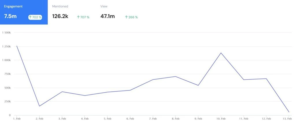 เมื่อสังเกตจากช่วงเวลาที่มีการพูดถึงวันวาเลนไทน์ตั้งแต่วันที่ 1-13 กุมภาพันธ์ 2025 พบว่า มีการพูดถึงมากถึง 126,199 Mentions และมีการมีส่วนร่วมถึง 7,458,634 Engagement