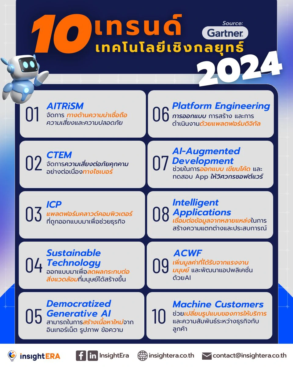 วันนี้อินไซท์เอราจะพาไปส่อง 10 เทรนด์เทคโนโลยีเชิงกลยุทธ์ในปี 2024 โดย Gartner ที่อาจส่งผลกระทบกับแบรนด์ได้ในอนาคต โดยแบ่งออกเป็น 3 ธีม ซึ่งช่วยให้แบรนด์สามารถนำไปปรับใช้กับธุรกิจได้