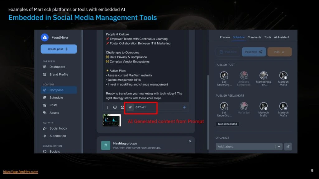 งานตั้งเวลาโพสต์ Social Media แต่ก่อนต้องทำเองทีละช่องทาง ปัจจุบันเครื่องมืออย่าง FeedHive ใช้ GPT ช่วยแปลภาษา เรียบเรียงใหม่ และใส่ Bullet / Icon ให้ Content อ่านง่ายได้เพียงสั่ง Prompt เดียว
