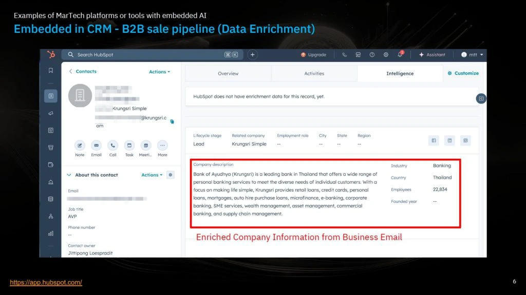 เมื่อก่อนการตัดสินใจขายหรือพูดกับลูกค้าต้องใช้วิจารณญาณแอดมิน แต่ปัจจุบันแพลตฟอร์ม CRM (เช่น HubSpot) มี AI Build-in ที่ทำหน้าที่คล้าย “เพื่อนคู่คิด” ช่วยสรุปข้อมูลลูกค้า แนะนำสินค้าที่น่าสนใจ และสามารถสั่ง AI ด้วยการแชทเพื่อสร้าง Workflow อัตโนมัติสำหรับแคมเปญได้