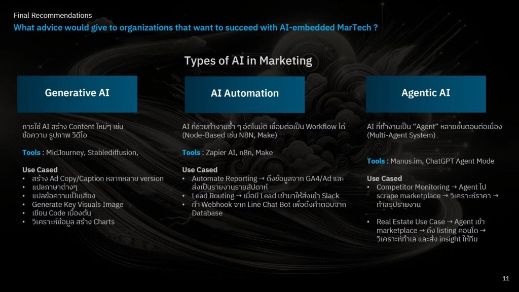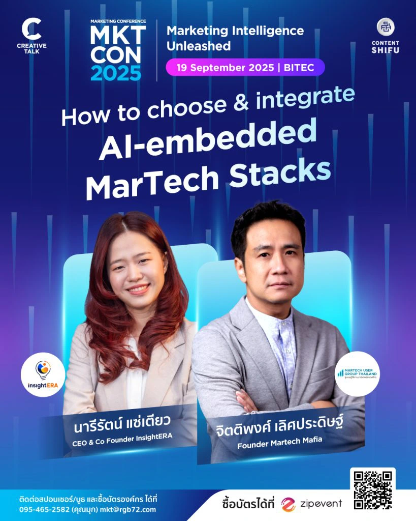 เปลี่ยน MarTech ที่ซับซ้อนให้เป็นแต้มต่อทางธุรกิจ: How to choose & integrate AI-embedded MarTech Stacks โดยคุณหยก นารีรัตน์ แซ่เตียว – CEO & Co-Founder, InsightERA และคุณบอล จิตติพงศ์ เลิศประดิษฐ์ Founder Martech Mafia (ขอขอบคุณเนื้อหาสรุปจากผู้จัดงาน MKTcon2025)