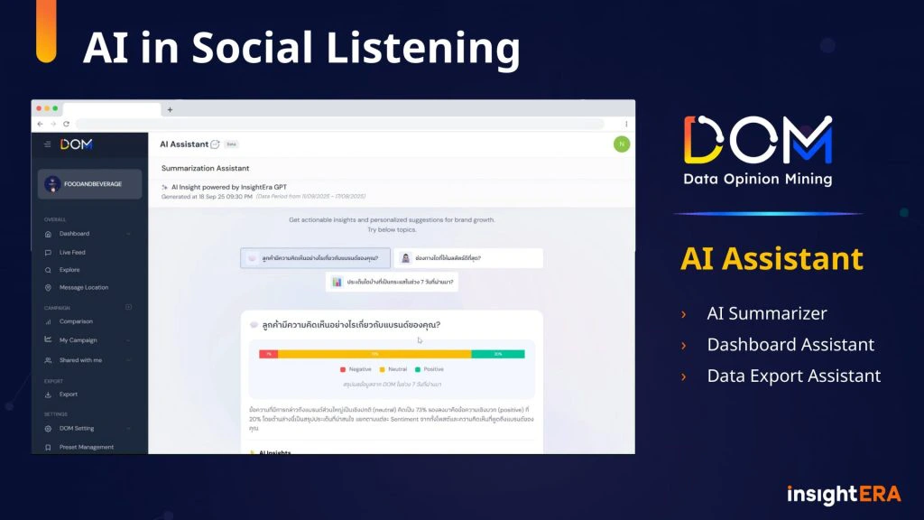จากงานที่ต้องมีทีมอ่านและสรุปเอง ตอนนี้ AI สามารถสรุปข้อมูล Sentiment (เชิงบวก/ลบ/กลาง) และเราสามารถพิมพ์ถาม AI เพื่อ Filter Dashboard หรือ Export ข้อมูลตามที่ต้องการได้แบบ Real-time
