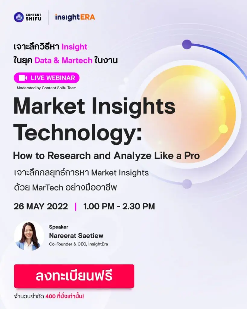 InsightEra ร่วมกับ Content Shifu จัดงาน Webinar แชร์ความรู้กลยุทธ์การหา Market Insights ด้วย MarTech วิเคราะห์และประยุกต์ใช้ข้อมูลเพื่อขับเคลื่อนธุรกิจในยุค Data & Martech Online Webinar ที่จะชวนคุณไปเจาะลึกวิธีการหา Insight ในยุค Data & MarTech ขอบอกเลยว่างานนี้นักการตลาดหรือเจ้าของธุรกิจไม่ควรพลาด!