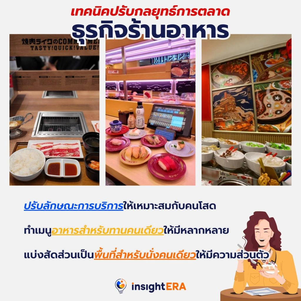 ไม่ว่าจะร้านอาหาร คาเฟ่หรือบาร์ จะต้องมีการออกแบบสถานที่เพื่อรองรับลูกค้าที่มาทานคนเดียวให้มีพื้นที่มากขึ้น โดยสามารถแบ่งสัดส่วนเป็นพื้นที่สำหรับนั่งคนเดียวเพื่อให้มีความส่วนตัว อย่างบาร์นั่งคนเดียว เช่น Sushiro, Yakiniku Like หรือร้านหม่าล่าสายพานต่างๆ ที่สามารถนั่งคนเดียวได้อย่างสบายใจรวมถึงการทำเมนูอาหารสำหรับทานคนเดียวให้มีหลากหลายมากขึ้นไม่เพียงแต่อาหารจานเดียวแบบเดิมๆ
