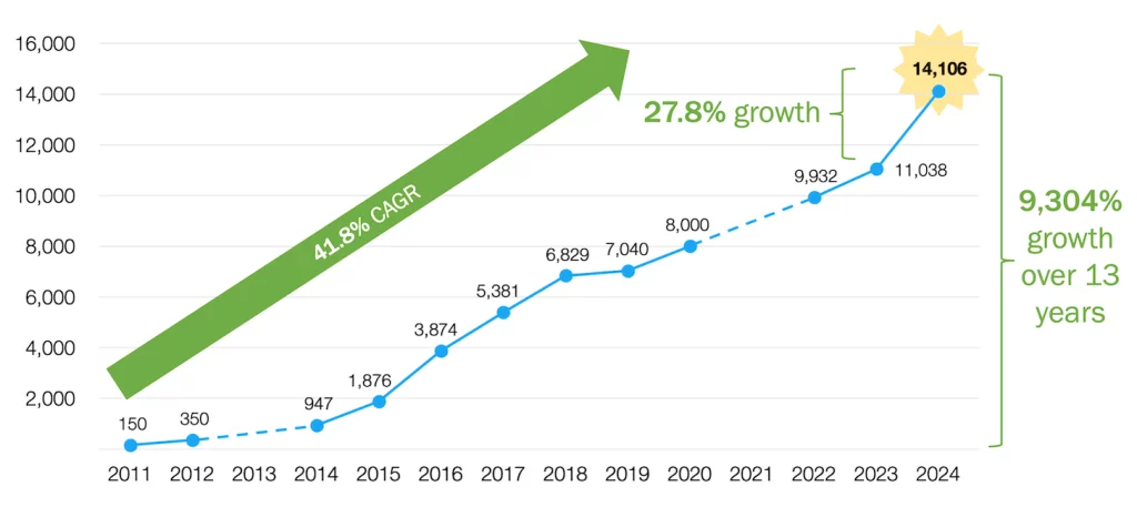 ตลอดระยะเวลากว่า 13 ปีที่ผ่านมา MarTech เริ่มจากการมีเครื่องมืออยู่ราวๆ 150 รายการ จนมาถึงตอนนี้ที่มีเครื่องมือกว่า 14,106 รายการ นับเป็นการเติบโตที่สูงถึง 9,304% และหากเทียบกับปี 2023 ปีนี้ MarTech เติบโตถึง 27.8% เลยทีเดียว
