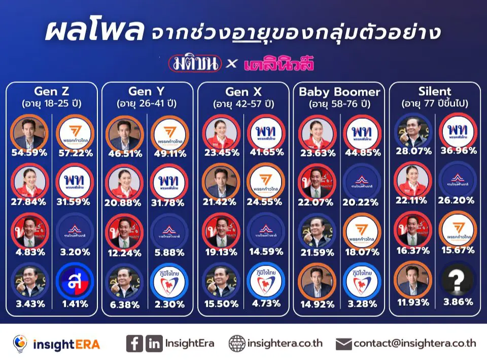 Generation X (อายุ 42-57 ปี) เป็นผู้มีส่วนร่วมมากที่สุดในโพลครั้งนี้ คือ 34.82% โดยมีความนิยมพรรคเพื่อไทย และ น.ส.แพทองธาร ชินวัตร เป็นอันดับที่ 1, พรรคก้าวไกล และนายพิธา ลิ้มเจริญรัตน์ เป็นอันดับ 2