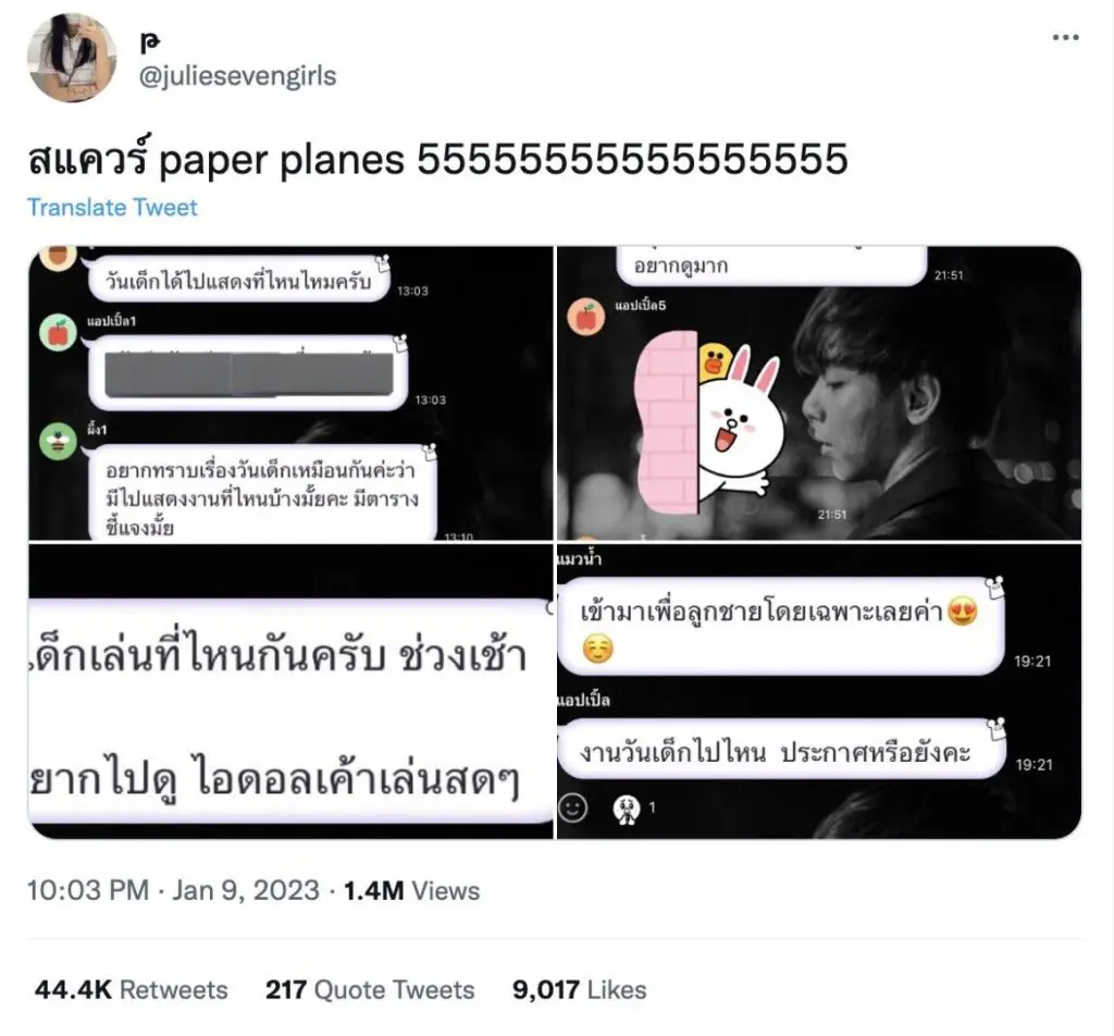 ด้วยความฮิตของเพลงนี้ยังคงไวรัลอย่างต่อเนื่อง ล่าสุดมีชาว Twitter ได้แชร์ข้อความที่กลุ่มผู้ปกครองของเด็กๆ สอบถามถึงคิวงานช่วงวันเด็ก ของวง Paper Plane ผ่านกลุ่ม Line Openchat เพื่อจะพาลูกหลานไปพบกับ ‘ไอดอลในดวงใจ’ ซึ่งมีคนให้ความสนใจ และแสดงความคิดเห็นเป็นจำนวนมาก โดยมียอดรีทวิตกว่า 4 หมื่นครั้ง และมียอดเข้าชมมากกว่า 1 ล้านวิวเลยทีเดียวค่ะ