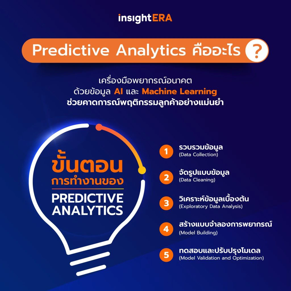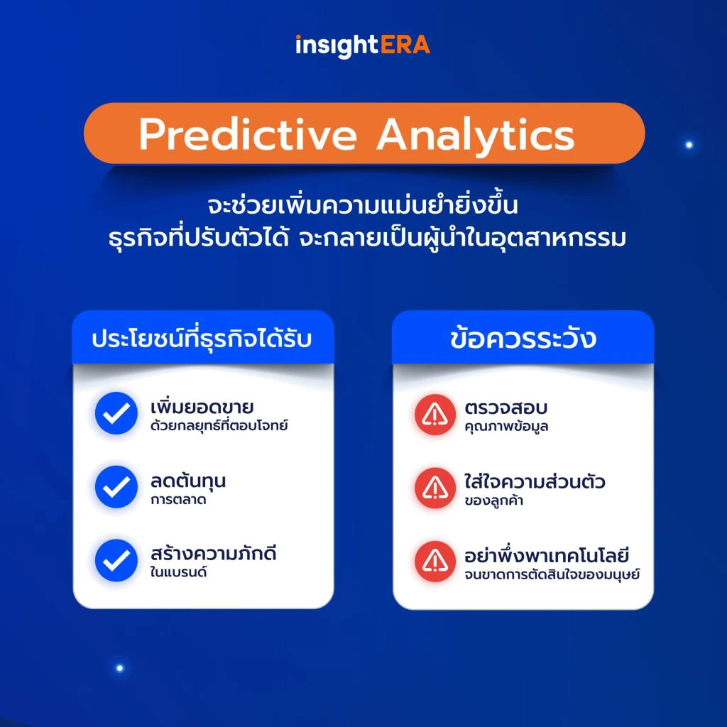 Predictive Analytics คือการใช้ข้อมูลที่มีอยู่ในปัจจุบันเพื่อทำนายเหตุการณ์หรือพฤติกรรมที่อาจเกิดขึ้นในอนาคต โดยอาศัยเทคโนโลยีปัญญาประดิษฐ์ (AI) และ Machine Learning เพื่อวิเคราะห์ข้อมูลจำนวนมหาศาล ประมวลผลหาความสัมพันธ์ และสร้างแบบจำลองทางสถิติที่แม่นยำ ตัวอย่างเช่น การพยากรณ์ว่าลูกค้าคนใดมีแนวโน้มที่จะซื้อสินค้าชิ้นใด หรือลูกค้ากลุ่มใดอาจเลิกใช้บริการ