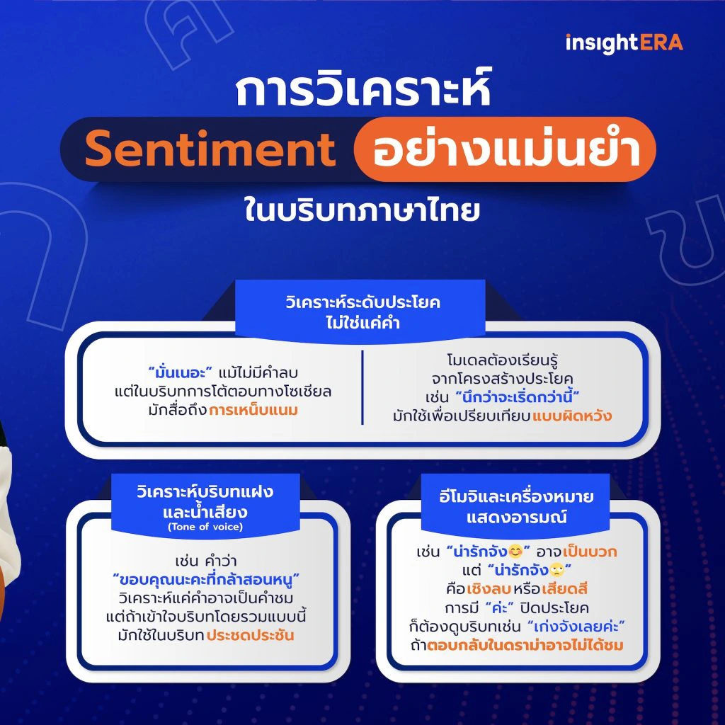 บนโลกโซเชียล การพูดเสียดสีหรือประชดประชันเป็นเรื่องปกติ เช่น การใช้คำว่า “ดีมากกกกกกก” อาจไม่ได้แปลว่าผู้ใช้พอใจจริงๆ แต่กำลังประชด การเข้าใจบริบทลึกๆ เหล่านี้ต้องอาศัยโมเดลภาษา (Language Model) ที่ฝึกจากบริบทภาษาไทยโดยเฉพาะ