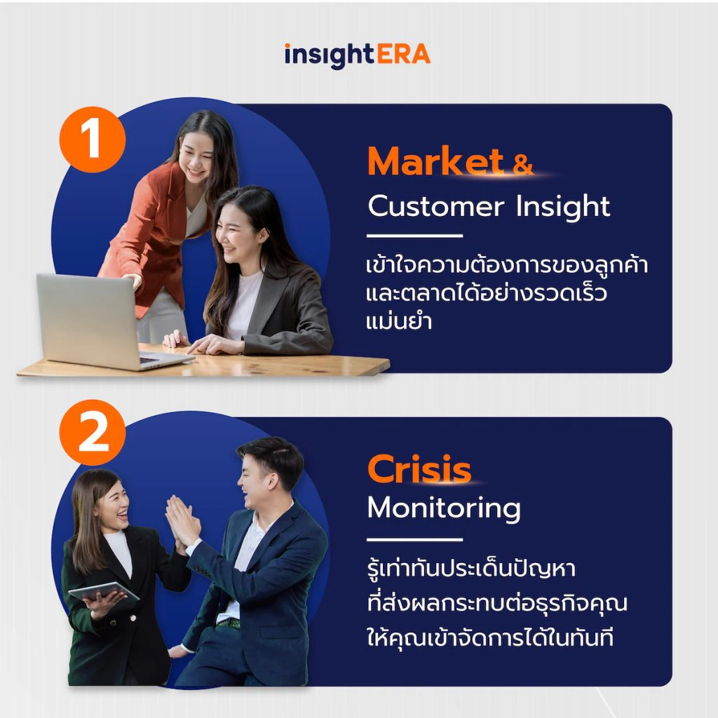 Social Listening สามารถวิเคราะห์ข้อมูลจากสื่อสังคมออนไลน์ เพื่อให้คุณเข้าใจความต้องการของลูกค้า และความต้องการของตลาดได้อย่างรวดเร็ว และแม่นยำ เพื่อวางแผนกลยุทธ์ในการสื่อสาร และให้บริการลูกค้าได้อย่างมีประสิทธิภาพ โดยใช้ระยะเวลาที่สั้นลง เมื่อเทียบกับ Market Research แบบเดิมๆ ให้คุณได้วิเคราะห์และเข้าใจข้อมูลได้ลึกขึ้น แม่นยำขึ้น เพิ่มศักยภาพในการแข่งขัน และสร้างการเติบโตให้กับธุรกิจของคุณ