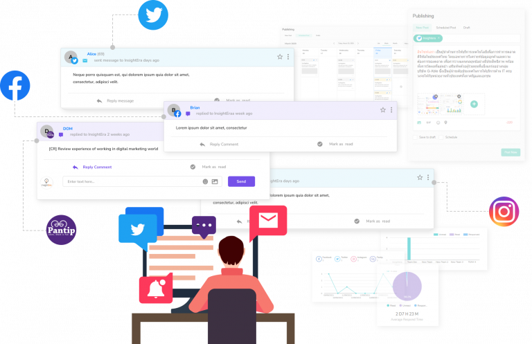 เชื่อมโยงทุก Social Media Account ให้สามารถบริหารจัดการผ่าน ระบบเดียว ไม่ว่าจะเป็นการโพสต์ หรือ ตอบข้อความ inbox พร้อม Dashboard แสดงประสิทธิภาพในการบริหารจัดการ