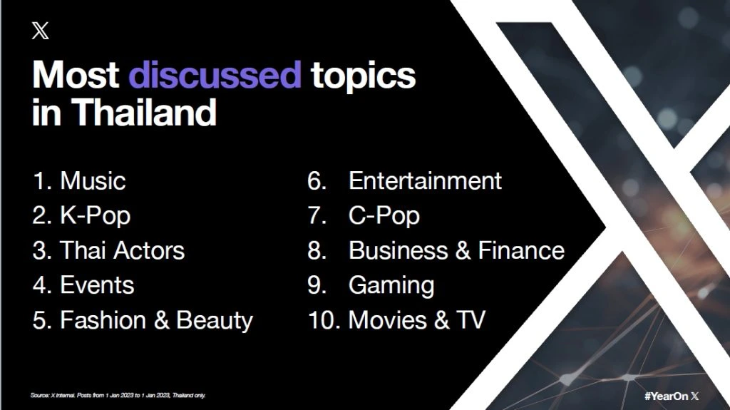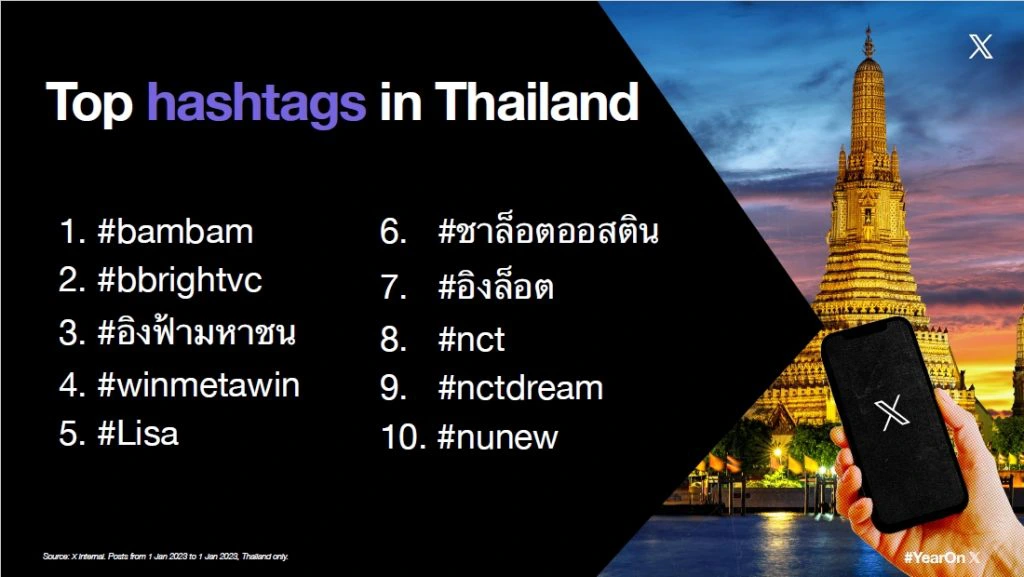 โดยสำหรับ #YearOnX Thailand Hashtag ที่ได้รับการพูดถึงมากที่สุดคือเป็นบุคคลดังที่มีชื่อเสียงและแฟนคลับมากมาย คือ #bambam หรือ แบมแบม กันต์พิมุกต์ ภูวกุล ศิลปิน K-Pop สัญชาติไทยชื่อดังระดับโลก นอกจากนี้ยังมีศิลปิน Boy Group สัญชาติเกาหลีเพียงหนึ่งเดียวที่ติดเทรนด์ยอดนิยมในประเทศไทยอย่าง #nct และ #nctdream ทำให้เห็นได้ว่าไม่เพียงแต่ศิลปินไทยเท่านั้นที่ได้รับความสนใจ แต่รวมถึงศิลปินต่างชาติด้วย