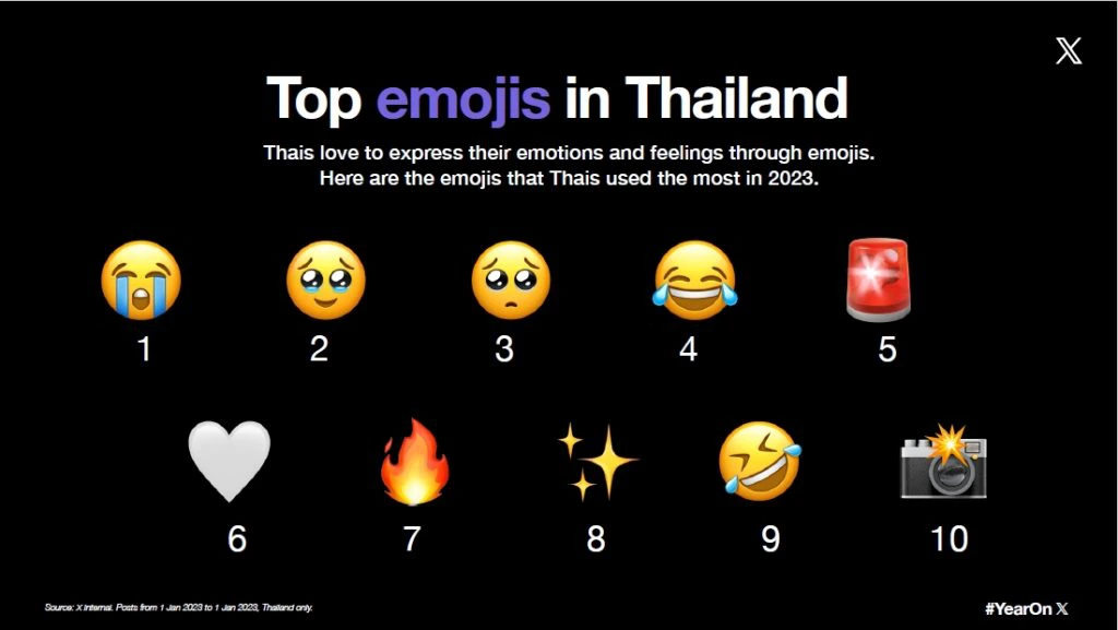 ในการติดต่อสื่อสารบนโลกออนไลน์ในปัจจุบัน เรามักนิยมใช้สิ่งที่เรียกว่า Emoji ซึ่งก็คือรูปใบหน้าที่สื่อถึงอารมณ์และไอคอนต่างๆ ในการแทนข้อความบางอย่าง บน X (Twitter) ก็เช่นกัน โดย Top Emoji ที่คนไทยใช้ มีดังนี้😭 = ร้องไห้หนักมาก🥹 = มีความสุขจนกลั้นน้ำตาไม่อยู่🥺 = ขอร้องอ้อนวอนหรืออยากได้ความรัก😂 = ร้องไห้เพราะความสุข🚨 = สัญญาณไฟแจ้งเตือน🤍 = ความรักที่บริสุทธ์🔥 = ไฟและความร้อน มักใช้เพื่อสื่อถึงความร้อนแรง✨ = ฝันแวววาว🤣 = ขำกลิ้ง📸 = กล้องถ่ายรูปที่กำลังจับภาพ